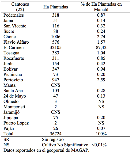 - Zona Sur: Jipijapa, Puerto López y Paján, en total 1.124 Ha plantadas, un 3,06 % de las