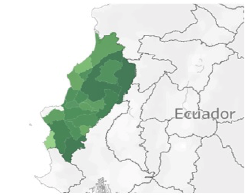 70,57% de superficie se encuentra en 5 provincias y en el 29,53% restante (Gonzabay, 2017). Esta mayoría como cultivo tradicional está asociado con: café, cacao, yuca y frutales, y el restante, está como monocultivo tecnificado (Santiesteban Mendes, 2014).