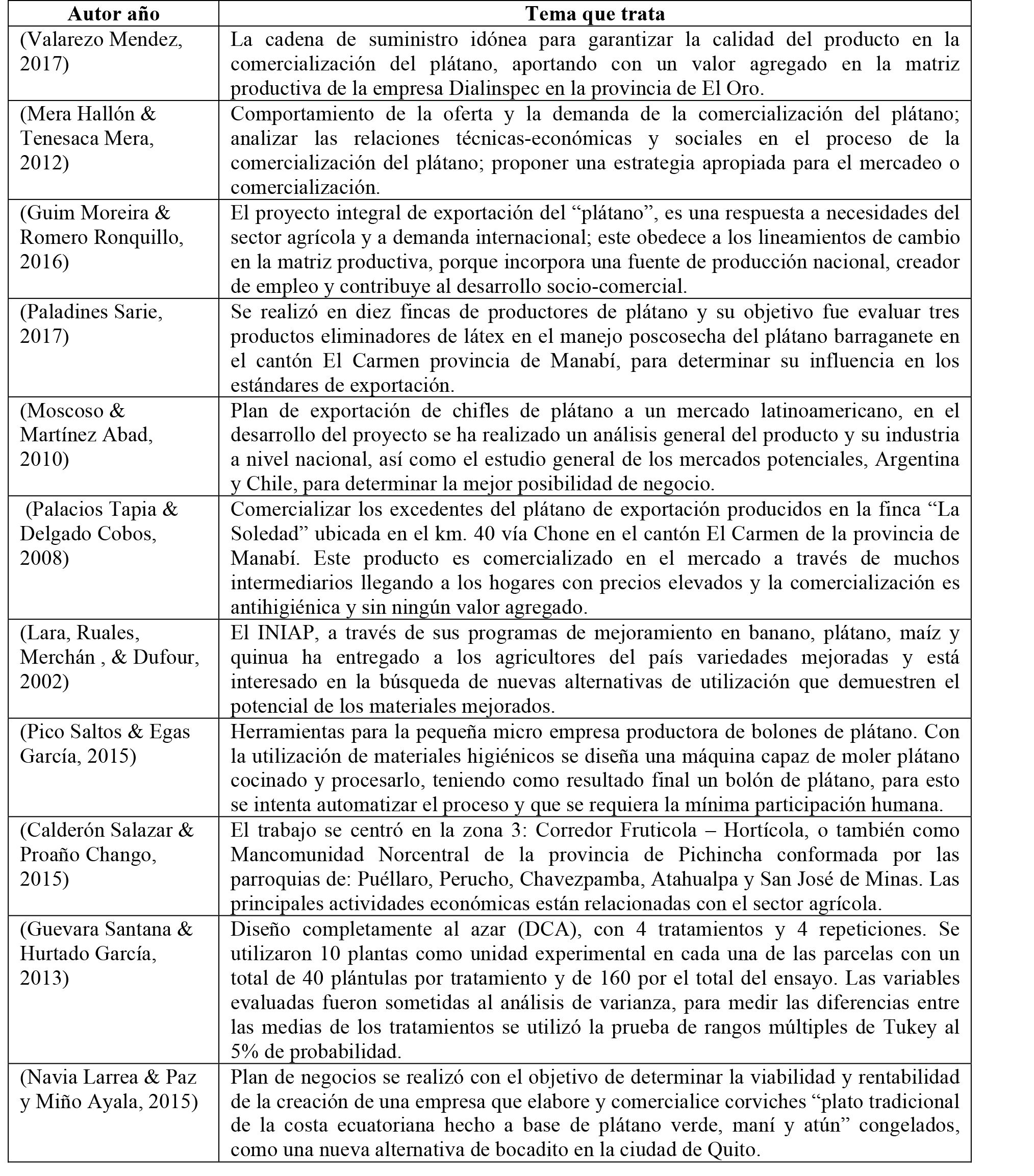 En cuanto a los estudios de cadenas de plátano en el Ecuador existen varios estudios, Tabla 7.