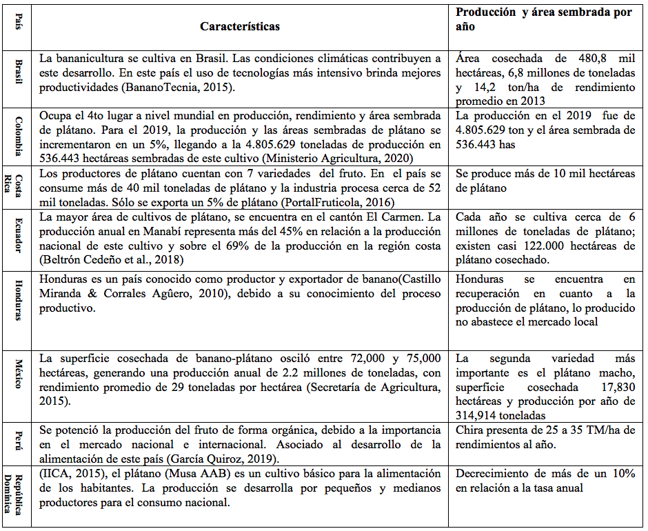 Tabla 1: Países donde se estudian cadenas de producción de plátano en Latinoamérica.