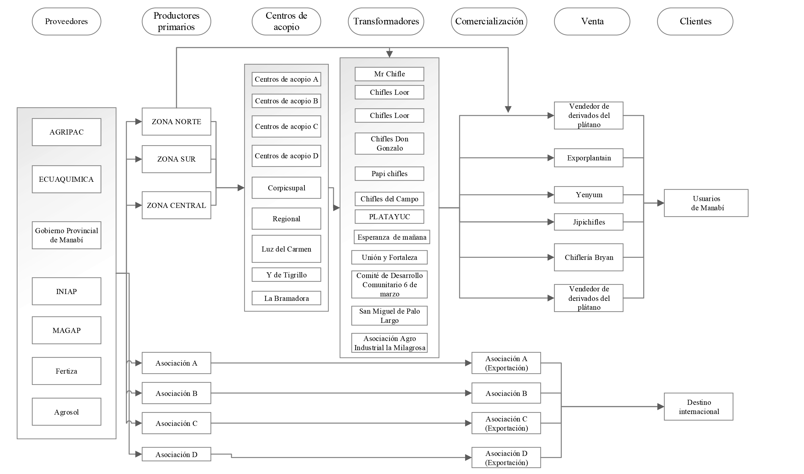 Provincial de Manabí, INIAP, MAGAP, Fertiza, Agrosol, Zona Norte, Zona Sur, Zona Central, Asociación A, Asociación B, Asociación C, Asociación D, Centro de Acopio A, Centro de Acopio B, Centro de Acopio C, Centro de Acopio D, Corpicsupal, Regional, Luz del Carmen, Y de Tigrillo, La Bramadora, Mr Chifle, Chifles Loor, Chifles don Gonzalo, Papi chifles, Chifles del Campo, PLATAYUC, Esperanza de Mañana, Unión y Fortaleza Comité de Desarrollo Comunitario 6 de Marzo, San Miguel de Palo Largo, Asociación Agro Industrial La Milagrosa, , Asociación A(exportadora), Asociación B(exportadora), Vendedor de derivados del plátano, Exporplantain, Yenyum, Jipi chifles, Chiflería Bryan, Venta de servicios de alimentos, Usuarios de Manabí, Destino internacional.