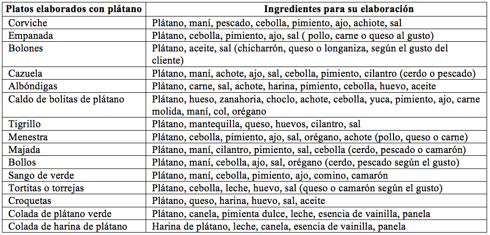Los platos ofertados en los locales gastronómicos a base de plátano son: corviche, empanada, bolón, tigrillo, bollo, patacón, cazuela, torreja, albóndiga, arañita, majada, croqueta, canastos, plátano asado, palitos de verde, raspado de plátano, chifles, sánduche de plátano, sango de verde, colada de plátano, caldo de bolitas de plátano, colada de harina de plátano, entre otros. Una encuesta publicada por Sepúlveda et al. (2017) conduce al siguiente comportamiento de consumo detectado: los patacones (61,5%) y los bolones (52,3%) son las principales preparaciones que se elaboran en los hogares ecuatorianos (Tabla 5). El patacón es una preparación culinaria que consiste en laminar trozos de plátano para después ser sofreídos. Por su parte, el bolón es elaborado a partir de masa de plátano previamente cocinado en agua. En orden de importancia se encuentran las tortillas de verde (31,3%), plátano asado (29,8%), chifles (chips) (24,3%) y (23,5%) en sopas.