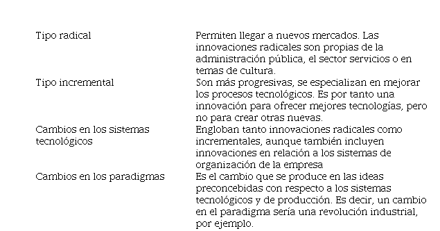 En definitiva, una empresa innovadora debe ser capaz de crear o renovar nuevos productos, servicios e incluso las técnicas de producción que utiliza. De igual modo, también tiene que realizar cambios en el sistema organizativo de la compañía, modificar las exigencias para la contratación de los profesionales y cualificaciones diferentes para la adaptación a los nuevos tiempos.