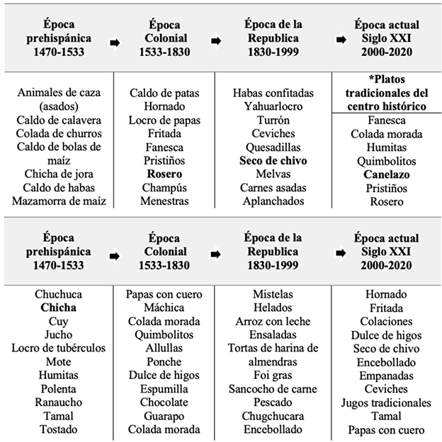 El análisis determinó una secuencia de sucesos que impactaron al desarrollo de la cultura gastronómica y patrimonio alimentario con diferentes adaptaciones gastronómicas; sea en su preparación, en la presentación del platillo o en su consumo, como es el caso de platos tradicionales que tienen mayor consumo en las festividades de la ciudad y en las plazas de los mercados cercanos al Centro histórico. De acuerdo a esto, se diseñó una línea de tiempo de la cocina quiteña, determinando los platos tradicionales-típicos más representativos hasta la actualidad, desde su origen hasta su trascendencia en cada época de la ciudad de Quito, definiendo los platos más emblemáticos.