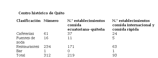 El número de establecimientos con más oferta en platos tradicionales de comida ecuatoriana-quiteña, son los restaurantes, cafeterías y las fuentes de soda con un total de 219 lugares en el Centro Histórico de Quito. Por lo tanto, se deduce que la cultura gastronómica dentro del sector se encuentra vigente y no ha desaparecido, excepto por la demanda y oferta de los establecimientos hacia el cliente. Por otro lado, se identificaron los elementos relacionados con la evolución de la gastronomía, y los cambios de los hábitos alimentarios en el ámbito cultural desde la época de la colonia, por el hecho histórico de la hibridación y mestizaje de las culturas, generando una neo-culturización en el Centro histórico de Quito. Consecuencia de esto, surgió una amalgama de conocimiento e intercambio cultural que existió y ha evolucionado como es ahora la cultura quiteña.