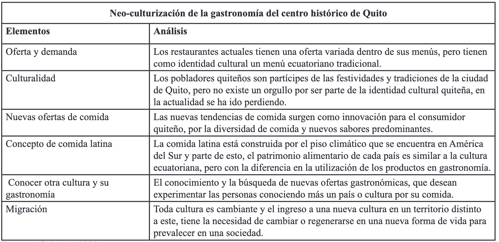 El análisis de la cultura gastronómica del centro histórico de Quito evoluciona con las nuevas adaptaciones gastronómicas y culturales en cada etapa del tiempo, como es la introducción de la neo-culturización. Desde un inicio comenzó con la mezcla de culturas como los quitus, incas, españoles, criollos o franceses, quienes fueron los precursores de lo que hoy es la gastronomía quiteña del centro histórico, y de igual forma, el intercambio regional de los saberes y conocimientos de los platos tradicionales más destacados del Ecuador, además de ser considerado Patrimonio de la Humanidad por su valor histórico, cultural y artístico.
