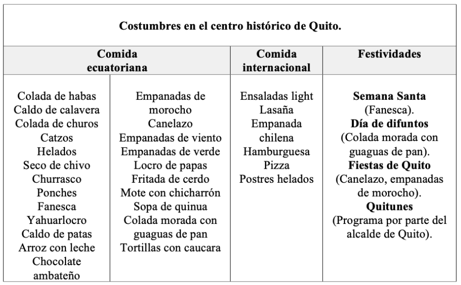 De acuerdo a esto, el centro histórico de Quito es considerado como patrimonio cultural de la humanidad por las edificaciones patrimoniales, los hechos y acontecimientos históricos que se manifestaron durante la época de la conquista española con el imperio incaico, y que ahora constituyen la herencia en la escuela quiteña, las festividades, costumbres y tradiciones, como parte del conocimiento de la cultura quiteña. Por lo tanto, el desarrollo de la conquista española, fue el “[…] resultado de la interacción entre la tradición culinaria negra, indígena y española, es decir, a los conocimientos, saberes y prácticas alimentarias resultado de la convivencia entre culturas diferentes. Las transculturaciones, son resultado de estrategias de imposición por la institución colonial. [...]” (Unigarro, 2015, pág. 38).