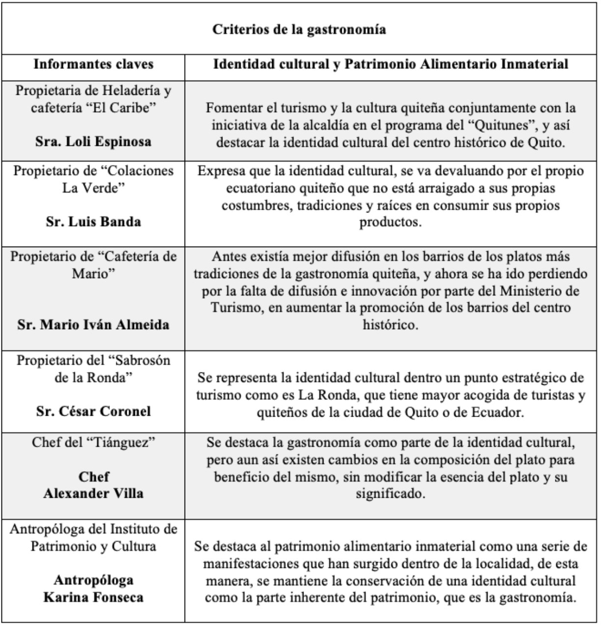Por otra parte, se desarrolló un análisis con los argumentos de los entrevistados, a los pobladores quiteños, quienes fueron los dueños de los establecimientos de comida tradicional, y la antropóloga experta en patrimonio alimentario. De acuerdo a eso, ellos argumentaron su propio criterio acerca de la identidad cultural como patrimonio alimentario inmaterial, según sus experiencias culturales, sus conocimientos y los cambios alimentarios, detallando el patrimonio alimentario inmaterial que mantiene el centro histórico de Quito.