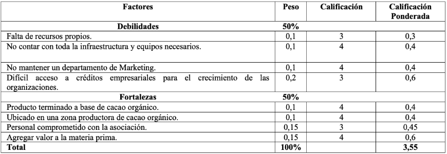 En el estudio se determinó que existieron aspectos clave según el FODA como contar con cacao orgánico, escaso acceso a financiamiento, competidores posicionados y posible aumento de capacidad de comercialización, situación que respaldan Labra et al. (2017) con Ramírez y Pérez (2018) quienes considera que la realización del análisis FODA permite un análisis de los factores de éxito que dan paso al cumplimiento de los objetivos de la organización, al mismo tiempo Veintimilla (2014) afirma lo anterior al establecer que dicho análisis contempla el establecimiento de factores clave internos y externos de la organización.