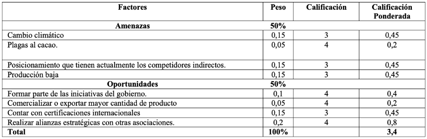 Se elaboró la matriz EFE basándose en los factores externos respecto a las oportunidades-amenazas, en la tabla 2 se determinaron los pesos correspondientes para cada factor, se calificó a criterio de las autoras respecto al conocimiento y la percepción obtenida, estableciendo a partir de esto una ponderación de 3,4, se resalta que la asociación aprovecha sus oportunidades con un total de 1,85 en relación con las amenazas que suman 1,55.