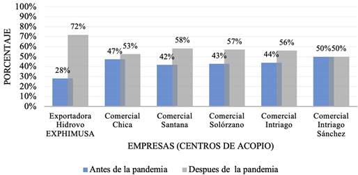 Por otra parte, es importante mencionar que la crisis sanitaria del Covid-19 afectó significativamente la economía del Ecuador debido al confinamiento obligatorio en los primeros meses de la pandemia, reduciendo las actividades del sector agropecuario y comercial. No obstante, la mayor parte de las comercializadoras encuestadas, manifestaron que en poco tiempo pudieron reiniciar sus actividades de manera ordenada, puesto que, para realizar el proceso de secado, no se requiere de un gran número de personal al mismo tiempo ni en el mismo espacio, por ello, los procesos retomados de forma paulatina para evitar cualquier tipo de contagio y manteniendo las medidas de bioseguridad en base a lo solicitado por el Ministerio de Salud Pública del Ecuador.
