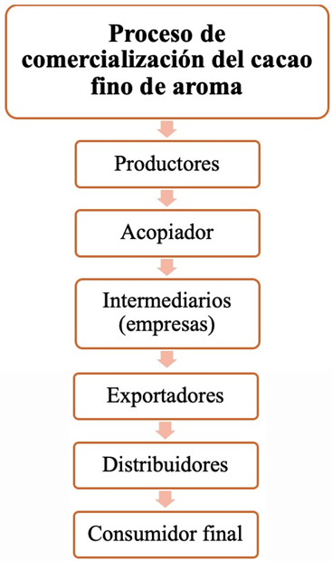 El proceso de comercialización se presenta cuando el agricultor acude a los centros poblados más cercanos a vender su producto a intermediarios, quienes acopian el cacao en lotes más grandes para entregarlo al exportador. Otra forma de realizar este proceso, es cuando el agricultor generalmente tiene una producción mayor, vende su producto directamente al exportador (Carreño, 2019) La práctica que se utiliza en estas transacciones, es la calificación que realiza el comerciante al producto que consiste no solo en la apreciación visual, sino que además toma en sus manos un puñado de granos de cada saco, corta varias almendras para evaluar el grado de fermentación, así como el porcentaje de humedad, que sirve para ocasionar al productor fuertes amonestaciones, que generalmente son descontados en el peso total del cacao.
