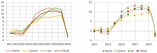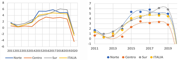 • RQ2: ¿han sido diferentes los efectos de Covid-19 sobre la rentabilidad de las empresas en las tres macro zonas en las que tradicionalmente se divide el país?