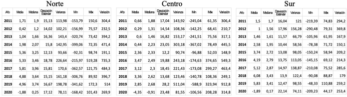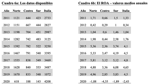 Los valores más bajos caracterizan al Centro (negativo a partir de 2019). En el Norte y el Sur, en cambio, el Roe tiene valores más altos, alcanzando picos del 6% en 2018 en el Sur. Además, en 2020 en el Norte el ROA adquiere valores negativos, debido a las pérdidas de explotación. Así, parece evidente el descenso de la rentabilidad debido a los cierres impuestos por la pandemia en el último año. La tendencia de los datos de la media del ROA se puede elaborar con más detalle calculando algunas estadísticas (Tablas 8 y 9).