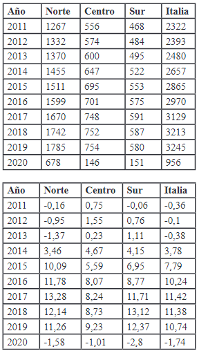 La tabla 1 muestra el número de datos disponibles para Italia y sus macro zonas (3a) y el valor medio del índice para cada año (3b).