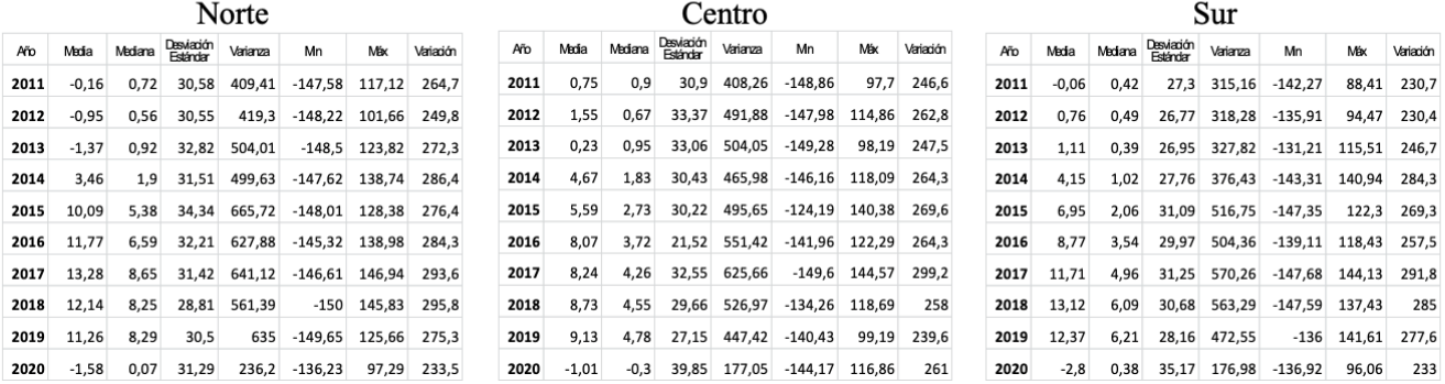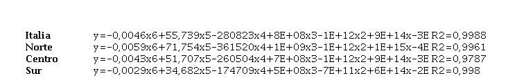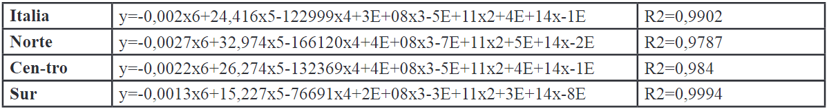 La tabla 6 muestra el número de datos disponibles para Italia y sus macro zonas y el valor medio del índice para cada año.