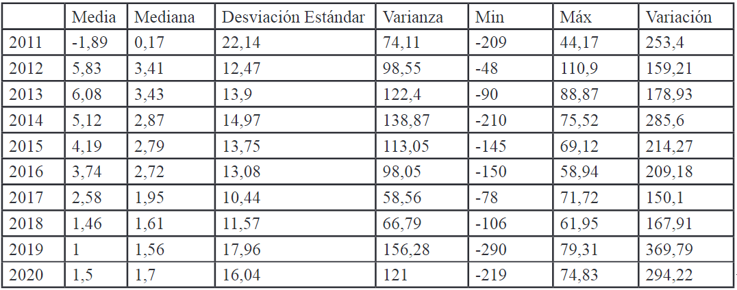 El descenso de la rentabilidad, debido a los cierres de negocios inducidos por la pandemia en el último año, parece pues evidente. Algunas estadísticas descriptivas (Tablas 3 y 4) aclaran aún más la situación expuesta, proporcionando una útil información analítica adicional.