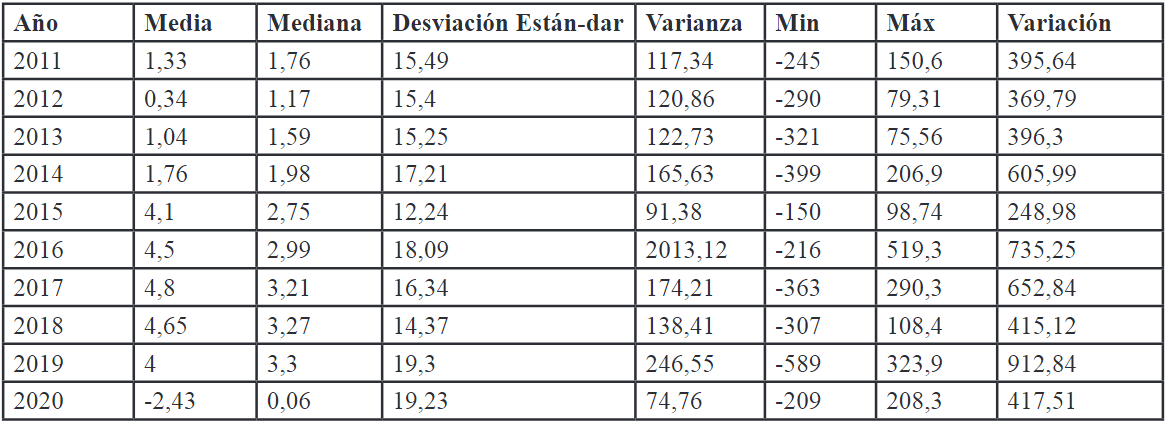 La cifra nacional tiene una mediana que se desvía poco de la media. La distribución de los datos es, por tanto, asimétrica: la mayoría de ellos tienen valores inferiores a la media. La desviación típica y la varianza tienen valores bastante elevados: por lo tanto, se puede decir que el rendimiento de los activos tiene una variabilidad considerable.