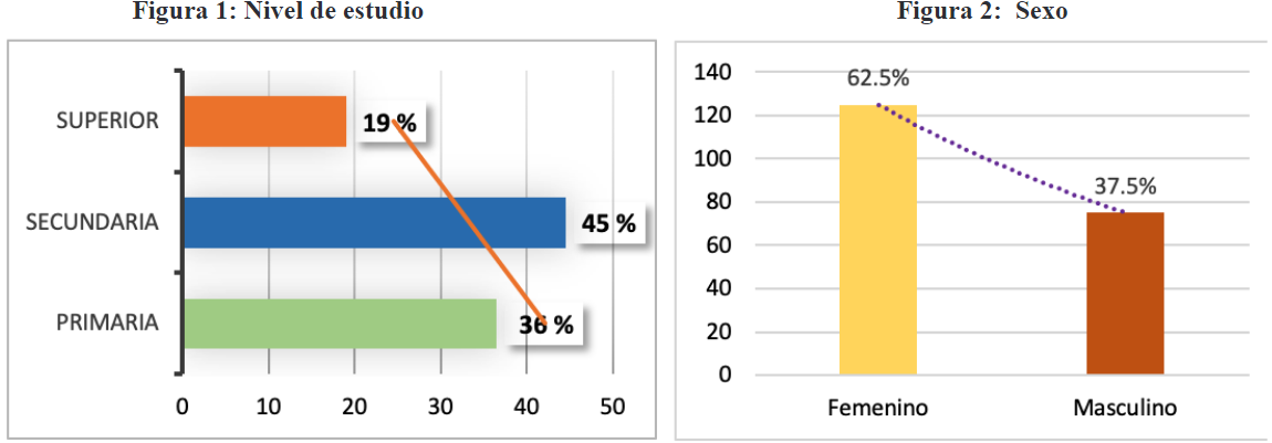 De acuerdo con los resultados expuestos en el gráfico 1, se corroboró que el 45% de los propietarios de los restaurantes han culminado la secundaria, el 19% son profesionales o se encuentran estudiando una carrera de tercer nivel y un número significativo (36%) solo ha culminado la primaria. La ausencia de conocimiento sobre el rendimiento y crecimiento de los negocios son temas de vital importancia, porque de ahí viene los fallos en el desempeño de los servicios de los restaurantes. En cambio, los que han culminado una carrera universitaria o por consiguiente están estudiando, tienen mejor habilidad para implementar estrategias los cuales permita mejorar su desempeño. Otro aspecto para notar y de acuerdo con el gráfico 2, la población objeto de estudio el 62,5% es de sexo femenino y de este porcentaje el 15% cuenta con un título de tercer nivel, 3% tiene estudios primarios y el 45% culminó la secundaria. En relación con el género masculino es 37,5% de manera general se interpreta y de acuerdo con sus comentarios expresados en el trabajo de campo ellos al ser cabeza de familia en su mayoría han tenido que elegir entre solventar los gastos familiares y la inversión en la educación. Adicional y de acuerdo con datos del Plan de Desarrollo y Ordenamiento Territorial del GAD Parroquial de Crucita (2019-2023) “considerando el primer nivel de los grupos de ocupación, el 50.48% de la población trabaja en la agricultura, ganadería, silvicultura y pesca, es del sexo masculino” (pág. 97)
