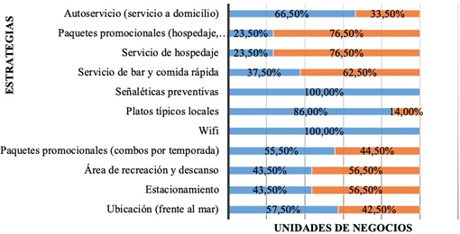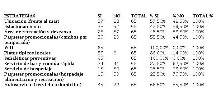 Algunos de estos locales forman parte de los programas que ofrece el MINTUR, el GAD Provincial de Manabí, el GAD Municipal de Portoviejo y el GAD Parroquial de Crucita por tanto parte de su estrategia es ofrecer comida típica con productos propios y frescos de mar siendo así que el 86% de la muestra ofrece este servicio como primera alternativa, sin dejar a un lado otros requerimientos culinarios por parte del cliente como comida gourmet. Asimismo, se evidenció que el 66.5% de las actividades económicas prestan servicios con entrega a domicilio, justificando que esta estrategia aporta de manera indirecta a sus ingresos ya que en su mayoría el paquete promocional inclusive la entrega sin cargos es asumida por el propietario y por ende el plato es entregado a menor costo por el hecho que ellos deben cubrir la comisión al repartidor. Sin embargo, manifestaron “que no la descartan porque la mayoría de los negocios aplica esta estrategia y considerar su no aplicación corren el riesgo de no ser elegidos por el cliente”