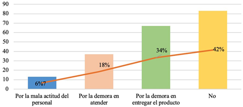 En referencia a la insatisfacción de los clientes acerca de la atención que reciben se corroboró que el 58% de las unidades económicas han recibido las respectivas observaciones y sugerencias, aunque se da por diferentes causas sobresaliendo la demora de la entrega del producto 34%. Asimismo, dentro del 58%; el 18% de los restaurantes han recibido quejas por la demora en atender al cliente, agregando que también se evidenció que el 6% de este sector tienen personal con mala actitud misma que perjudica al negocio que es catalogado por el servicio ofrecido al cliente. Cabe recalcar que el desempeño laboral es importante para obtener rentabilidad en el negocio, en este caso el personal debe ser motivado, dirigido y entrenado para brindar un excelente servicio. En cambio, el 42% manifiesta que hasta la fecha no se ha recibido quejas por parte de sus clientes. Los propietarios de acuerdo con sus comentarios alegan que generalmente estas quejas son recibidas en temporadas altas ya que en ocasiones no contratan más personal sino más bien se trabaja con lo que se cuenta esto porque sus ingresos a pesar de que la demanda aumenta ayudan a compensar en temporada baja ya que aseguran que relativamente bajan sus ingresos y generalmente el gasto siempre es fijo (Sueldos empleados, impuestos, gastos generales y de limpieza, servicios básicos, etc.).