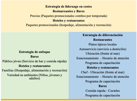 En el caso de la estrategia de liderazgo en costes está claro que el ofrecer paquetes promocionales les funciona a los bares y restaurantes de los hoteles permitiendo que lideren en este segmento ya que el cliente o turista lo ve un ahorro en relación con costo individual del servicio. En la estrategia de enfoque las unidades de negocios que prestan sus servicios están dirigidos a un segmento especifico es el caso de los bares y restaurantes en hoteles ya que existen consumidores que tiene gustos y preferencias por un producto o servicio concreto; y por último esta la estrategia de diferenciación en donde el servicio prestado tiene como finalidad que el cliente lo perciba como único y sobre todo que invierta o cancele un mayor costo por ellos, es el caso de bares y restaurantes en hoteles que son elegidos por los clientes por tener servicios no tan comunes entre ellos la ubicación, platos típicos locales, servicio a domicilio y sobre todo el horario de atención, en el caso de bares sobresale la gama de cocteles que ofrecen y su especialidad en la comida rápida.