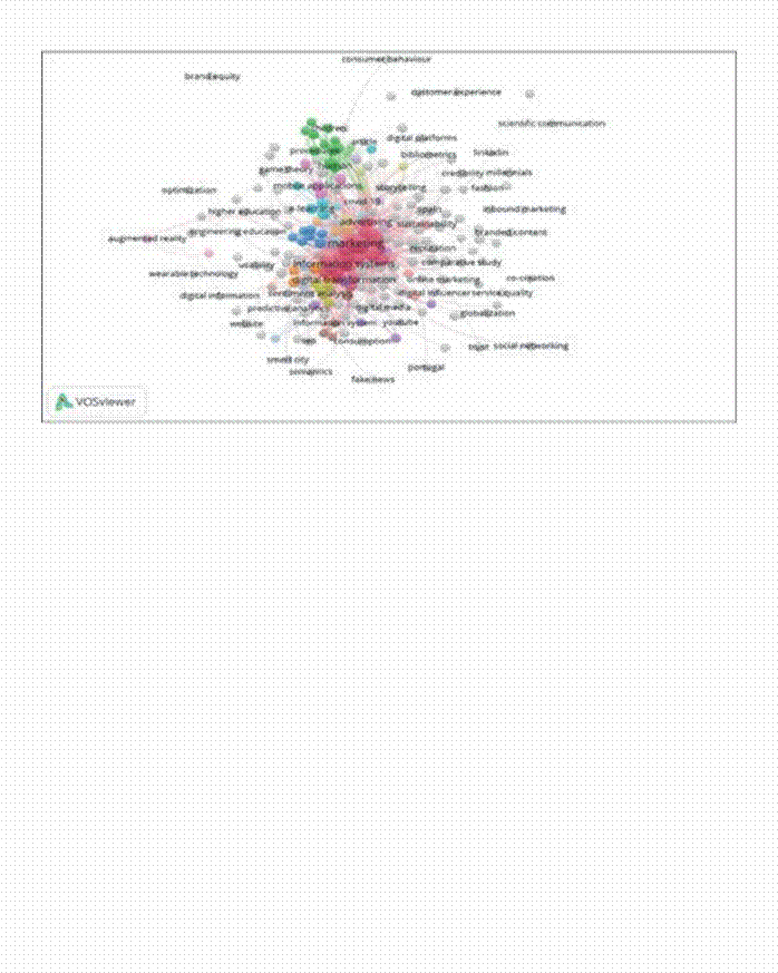 La palabra “marketing” se encuentra en el centro de la red y forma parte del cluster más destacado de la figura. Posee el mayor grado nodal y un total de 206 enlaces, en sus 127 apariciones. Se observa además que existe una fuerte relación entre las palabras clave “digital marketing” y “commerce”, demostrando que los autores tienden a publicar las investigaciones sobre estas temáticas, y que con mayor frecuencia las asignan como palabras clave en su conjunto. También se utilizan repetidamente los términos “sociales networking (online)”, “Facebook”, “Internet” y “e-commerce” aludiendo al abordaje de tópicos relacionados con los medios de comunicación digitales.