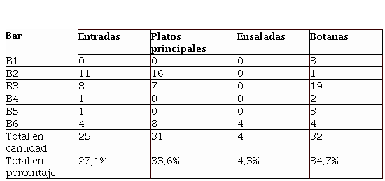 Hay que señalar que en dos de los establecimientos objeto de estudio, se ha evidenciado la demora inicial para atender al cliente, la cual excede los tres minutos del estándar planificado; en otros dos de los seleccionados, se aprecia que la oferta en la barra no cuenta con carta menú situadas en ellas, solamente en una de las barras tienen disponibles botanas a lo largo de la misma. En cuatro bares no se aplican ruedas de menú de botanas; no se sitúan los posavasos como indicativo que el cliente ya ordenó su pedido y tampoco se le sitúa el vaso de agua al servir aguardientes en su estado natural.