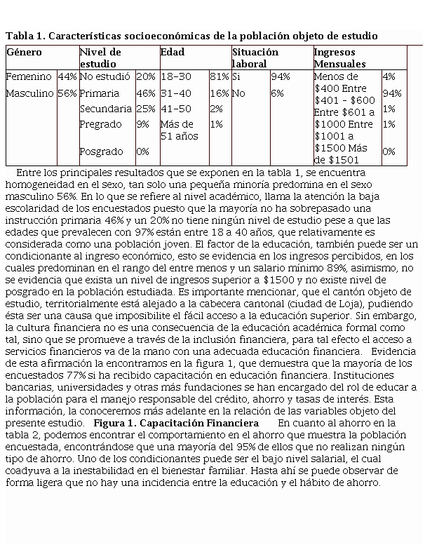 Evidencia de esta afirmación la encontramos en la figura 1, que demuestra que la mayoría de los encuestados 77% si ha recibido capacitación en educación financiera. Instituciones bancarias, universidades y otras más fundaciones se han encargado del rol de educar a la población para el manejo responsable del crédito, ahorro y tasas de interés. Esta información, la conoceremos más adelante en la relación de las variables objeto del presente estudio.