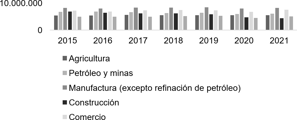 Como se aprecia, en la industria manufacturera, el VAB disminuyó en 6,9% en el 2020, en comparación de otras industrias, en cuanto el sector de comercio, presentó una variación negativa de 8,2%, sector vinculado directamente con el desempeño industrial afectado por restricciones de movilidad, afectando todas las actividades comerciales. El sector de Petróleo y minas bajó 9,0% en el 2020, esto debido a la producción nacional de crudo de 175,4 millones de barriles, es decir, 9,5 menos que el año anterior. En cuanto al sector Agrícola presentó un decrecimiento de 0,6%, sin embargo, en cultivos como banano, café y cacao, aumentó el 3,6% y 0,1% respectivamente.