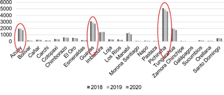 En la figura 4 se aprecia que el 27,46% de las 16.778 empresas registradas en 2020, pertenecen a la provincia del Pichincha, seguido Guayas (16,32%), Azuay (10,36%) y Tungurahua (10,31%). Ecuador es un país con alta tasa de informalidad en toda América Latina, para 2019 tuvo 46,7%, según datos del INEC, sin embargo, uno de los efectos de la pandemia, fue la disminución de empleo formal e incremento del informal. Para el segundo trimestre del 2020, la cifra fue 6,6% menos que el año anterior, es decir, un 39,8%. En cifras reales, representa 318 mil personas que perdieron su empleo. La contracción del sector ha ido a la par con el cierre de empresas pymes, las cuales acogían buen número de trabajadores. Por datos del Instituto Ecuatoriano de Seguridad Social (IESS) 85% de empleadores y 89% de trabajadores no están afiliados al seguro social, algo que preocupa, ya que están expuestos y desprotegidos frente eventos como accidentes laborales, desastres naturales, y demás.