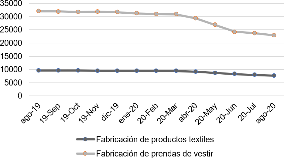 En la figura anterior se aprecia que, en los primeros meses del 2020, el sector tenía 40,666 trabajadores, posteriormente bajó a 30.545. Es decir, un cuarto de trabajadores del sector textil, se desplazaron al desempleo o la informalidad.