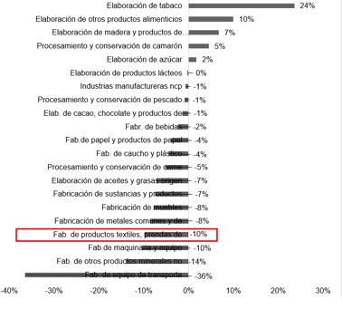 Como parte de la industria manufacturera, está el sector textil y confección, el cual aporta el 1% al PIB nacional, según datos del Banco Central, sin embargo, las limitaciones de producción y distribución provocó fuertes estragos a nivel nacional. Para el 2020, el sector decreció un 9,9% entre enero y septiembre, pero las ventas disminuyeron a un -40%, lo cual se analizará más adelante, cabe resaltar que la industria textil y de confección es importante en la economía total, representa el 5,9% del sector industrial, y un punto porcentual para el Producto Interno Bruto, el 0,8%.