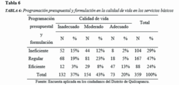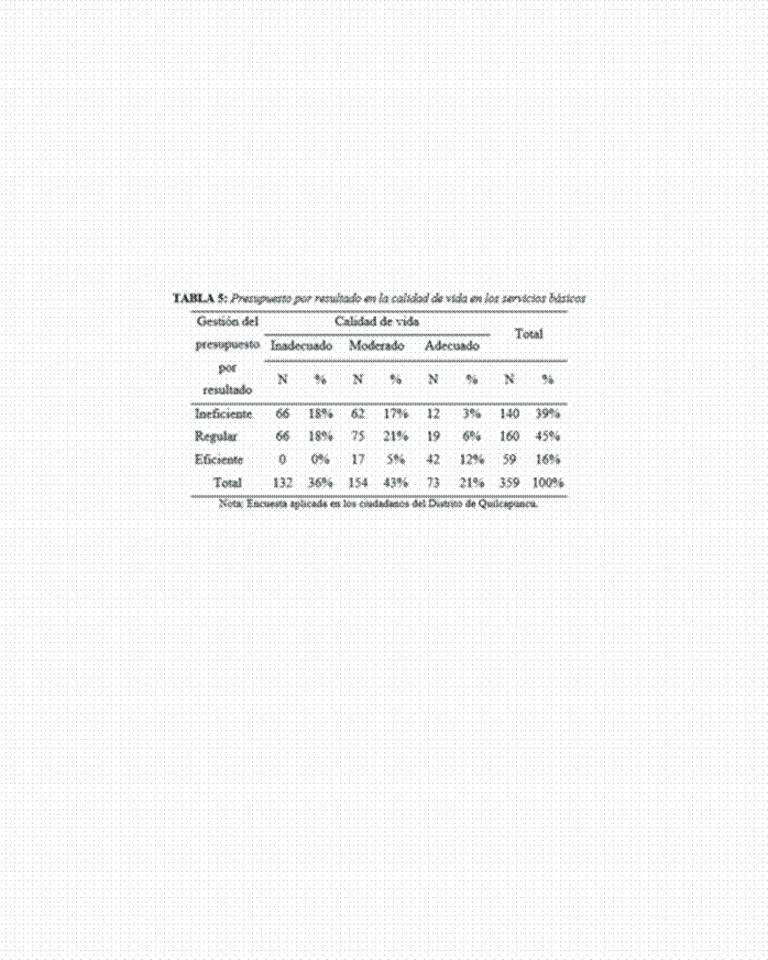 Tabla 5. Presupuesto por resultado por resultado en la calidad de vida en los servicios básicos