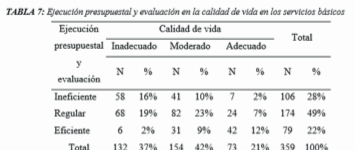 Tabla 7. Ejecución presupuestal y evaluación en la calidad de vida en los servicios básicos