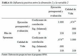 Así mismo se identificó la influencia de la ejecución de presupuesto y evaluación; evidenciándose que de un 49% el 23% manifiestan que la ejecución del presupuesto y evaluación es regular y la calidad de vida es moderada. De igual forma, el coeficiente de (Rho de Spearman) demuestra su valor de relación de (Rho = 0.474) mostrando una correlación positiva media; el resultado de ejecución del presupuesto y evaluación incide de manera positiva con la calidad de vida; observando el conocimiento que tienen no es suficiente ni adecuado porque en cuanto al manejo del presupuesto no lo estiman de forma exacta.