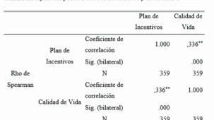 El plan de incentivos incide en la calidad de vida; reflejando que de un 54% el 26% indican que el plan de incentivos es regular y la calidad de vida es moderada, así mismo, el coeficiente (Rho de Spearman) presentó un nivel de relación (Rho = 0.336) mostrando relación media positiva; se concluye que, el plan de incentivos influye de forma positiva con la calidad de vida; observando que los funcionarios no se enfocan en cumplir con lo que se tenía programado en cuanto a metas por lo que no se alcanza a la transferencia del bono adicional