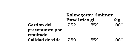 En la tabla 3, observamos que por medio de la prueba anterior de Kolmogorov – Smirnova, para una muestra de 359 ciudadanos, se observa que la significancia estadística (sig.) es de 0.000, siendo este el valor de p, y como no es mayor a 0.05. es rechazado la Ho, y se admite la alterna, vale indicar que ambas variables siguen una distribución no normal, en el gráfico se puede visualizar de mejor manera la distribución de datos, Valderrama (2009) señala: