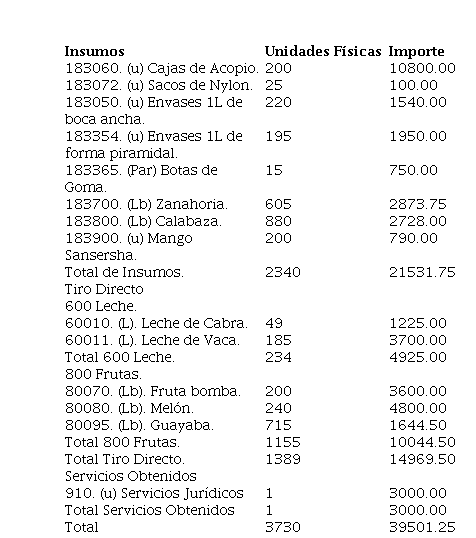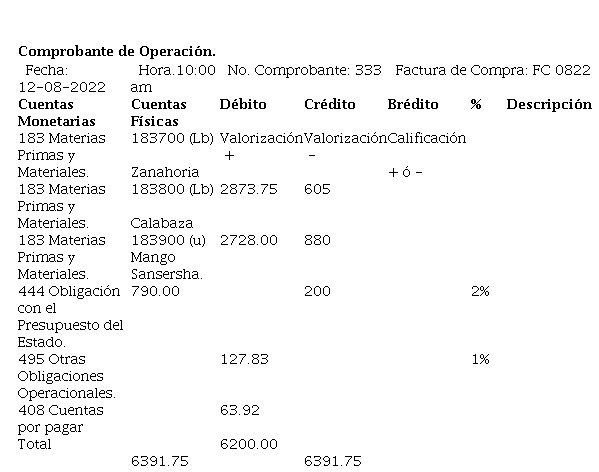 Del marco teórico anterior se concluye, que la CFM abarca en su totalidad los fundamentos de la Contabilidad a partida doble. Las tablas 6, 7,8 y 9 representan el tránsito de la unidad física por una entidad. El comprobante de operación de la Figura 6, muestra la compra de 605 lb de Zanahoria a $ 2873.75, 880 lb de Calabaza a $ 2728.00 y 200 u de Mangos a $ 790.00. Se descontaron las obligaciones quedando por pagar $ 6200.00.
