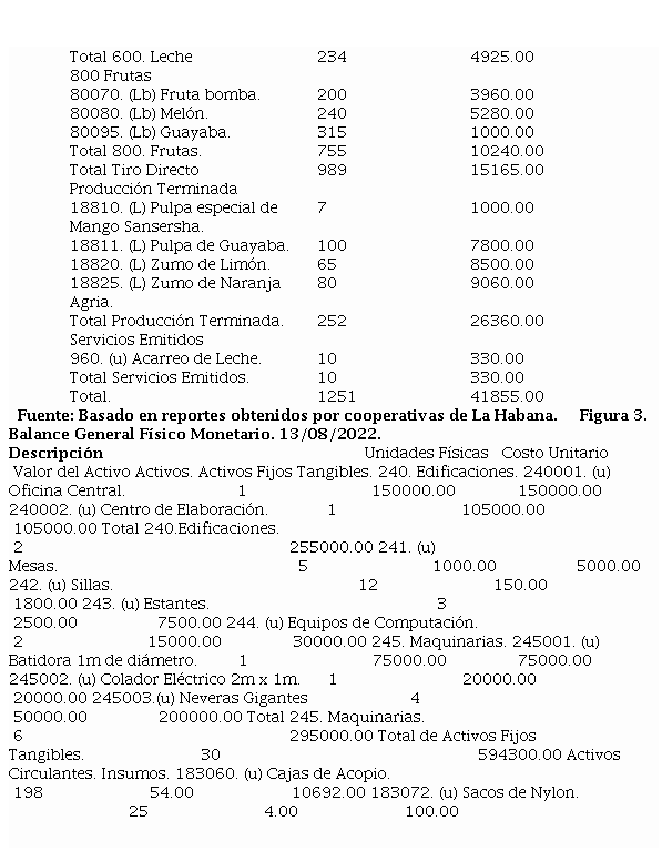 Los estudios que realicé en La Habana por más de 11 años, arrojaron que varias cooperativas cuentan en su contabilidad, unidades distintas a la monetaria, correspondientes a sus producciones terminadas, a la materia prima utilizada y al tiempo, otro grupo la ha hecho alguna vez y algunas lo hacen de forma intermitente. En este contexto se inserta la propuesta de Contabilidad Física Monetaria (CFM).