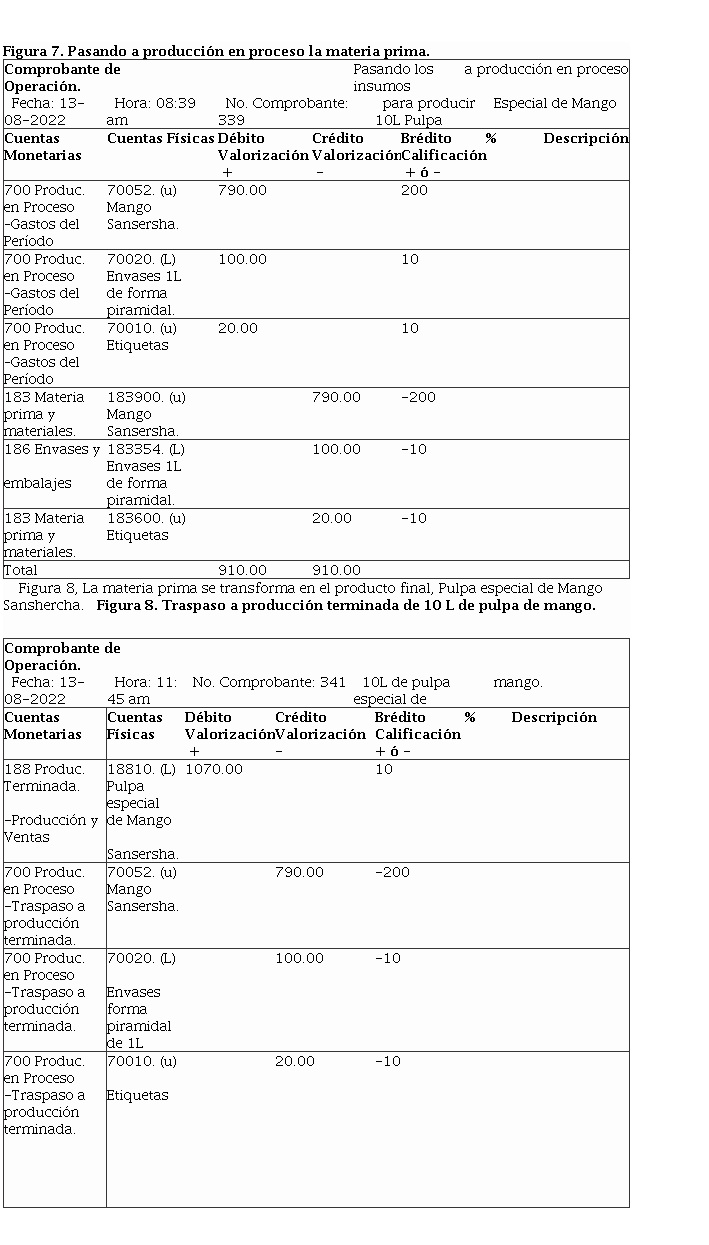 La figura 7, Indica la entrada de las materias primas a las cuentas de producción en proceso, donde normalmente estarán (si no se realiza algún ajuste contable) hasta que se elabore el producto final. 200 u de Mango, 10 etiquetas y 10 envases, se utilizan para elaborar Pulpa de mango.