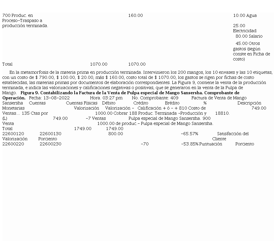 En la metamorfosis de la materia prima en producción terminada. Intervinieron los 200 mangos, los 10 envases y las 10 etiquetas, con un costo de $ 790.00, $ 100.00, $ 20.00, más $ 160.00, costo total de $ 1070.00, los gastos se rigen por fichas de costo establecidas, las materias primas por documentos de elaboración correspondientes. La Figura 9, contiene la venta de la producción terminada, e indica las valorizaciones y calificaciones negativas o positivas, que se generaron en la venta de la Pulpa de Mango.