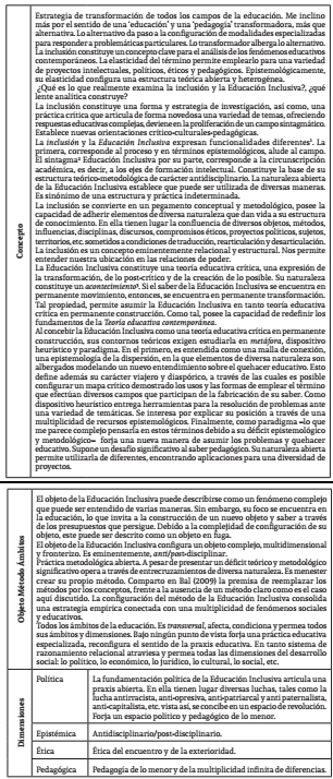 La estructura de conocimiento de la Educación Inclusiva es configurada a partir del entrecruzamiento de una multitud de prácticas teóricas y metodológicas de naturaleza heterogéneas. Su carácter abierto permite su utilización de diversas maneras y sentido. Sin duda, el sintagma Educación Inclusiva –como se discutirá en páginas posteriores– se convierte en un término homogéneo cuando se coloca en relación con la Educación Especial, dando paso a una lógica de sentido basada en la abyección. Su potencial interpretativo se estructura a partir de la múltiples posicionalidades analíticas.