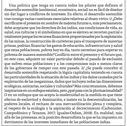 La explotación de las materias primas de origen agrícola y minero se ha llevado a cabo con desprecio por el medio ambiente, con un cuestionamiento de los nuevos derechos obtenidos por las poblaciones indígenas cada vez más devueltas a su condición de subciudadanos de ayer en los países andinos, un deterioro de la salud de los campesinos y los mineros3. Luego es «justificada» por los gobiernos, incluso los progresistas, por los recursos presupuestarios provenientes de la explotación de estas materias primas, que se utilizan, en el mejor de los casos, para financiar un aumento de los gastos sociales (escolaridad, salud) para que el sacrificio de la generación actual pueda ser beneficioso para las generaciones futuras ...