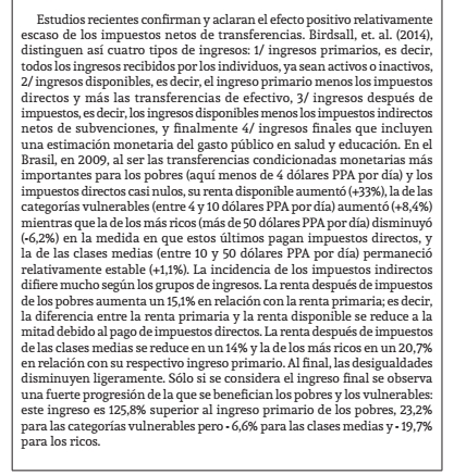 Las desigualdades de ingresos tendieron a disminuir en la década de 2000 hasta el advenimiento de la crisis para el 95% de la población. El 5% más rico y especialmente el 1% más rico (Salama, 2015; Medeiros et alii, 2014; Alfonso, 2014; Morgan, 2017; Iguales-Oxfam, 2018) han experimentado, incluso durante la primera década del 2000, un aumento en términos absolutos y relativos de sus ingresos -en contra del discurso oficial- debido principalmente al creciente peso de las finanzas. Con el inicio de la crisis en el segundo semestre de 2010 -que afecta principalmente a Brasil, Argentina, Venezuela- y la desaceleración económica (México...), las desigualdades de ingresos aumentan y la pobreza vuelve a crecer.