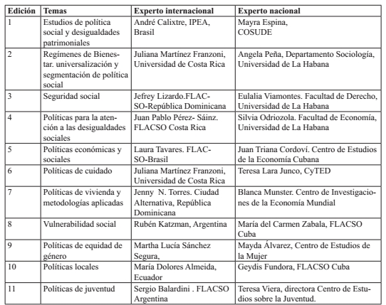 Para cada una de las sesiones diseñadas se invita a un experto/a cubano y un experto/a internacional. Ello ha sido un aporte de especial interés, en tanto confluyen diversos referentes sobre las políticas, se enriquecen prácticas y metodologías, donde Cuba se erige como un referente de elevado valor en materia de políticas sociales y al mismo tiempo se puede nutrir de enfoques novedosos que se gestan en la región. La tabla 1 muestra la relación de los temas trabajados hasta el momento y los expertos invitados para cada uno de los seminarios.