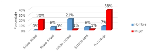 Esta situación se refleja en el salario que perciben por la prestación de sus servicios (Gráfica 11): del 22% de mujeres empleadas, el 20% se ubica en la escala inferior de ingresos del grupo (de $4,500 a $5,000 pesos mensuales), mientras todos los hombres se ubican en escalas superiores, la mayoría (el 21%) con salarios entre $7,500 y $10,000 pesos al mes. Se podría decir que las mujeres han ido incorporándose en el mercado laboral, pero siguen estando en desventaja al buscar trabajo con una retribución salarial igual a la de los hombres.