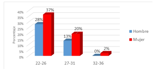 Al relacionar las variables sexo y edad de los egresados de esta generación (Gráfica 2), se observa un predominio de mujeres jóvenes: el 57% de las egresadas están en el rango de edades entre 22 y 31 años.