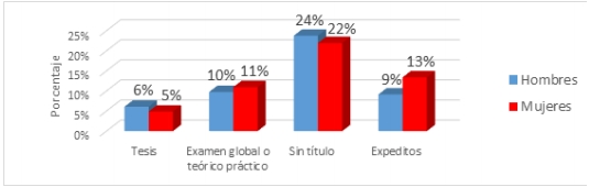 En el caso de los egresados de la Licenciatura en Economía, las estudiantes mujeres acabaron antes la carrera e incluso se titularon antes que los varones: la Gráfica 3 presenta los resultados de titulación de la generación 2010-2014, en los cuales se observa que las mujeres egresan de diferentes formas que los hombres y son ellas quienes más rápido adquieren el grado de licenciatura.