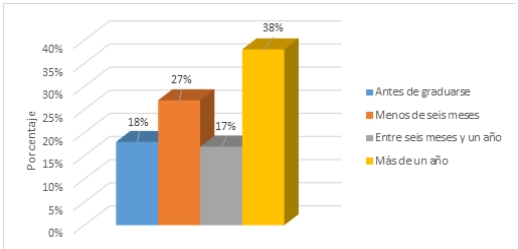 Sin embargo, la encuesta mostró datos favorables en cuanto a los tiempos en el acceso al empleo (Gráfica 5), si se tienen en cuenta las dificultades imperantes con la ocupación en el país y en el estado: el 45% de los egresados encuestados encontró un trabajo acorde con su perfil profesional antes de los seis meses (de ellos, el 18% lo logró incluso antes de graduarse) y de conjunto, el 62% demoró menos de un año. Esto se explica por el hecho de que la oferta de economistas en Guerrero no es muy grande y que la mayoría de los egresados de la UAGro se encuentran ubicados en Chilpancingo, la capital del estado, donde hay una mayor actividad política y económica que en otras regiones, todo lo cual repercute en un aceptable nivel de accesibilidad al empleo.